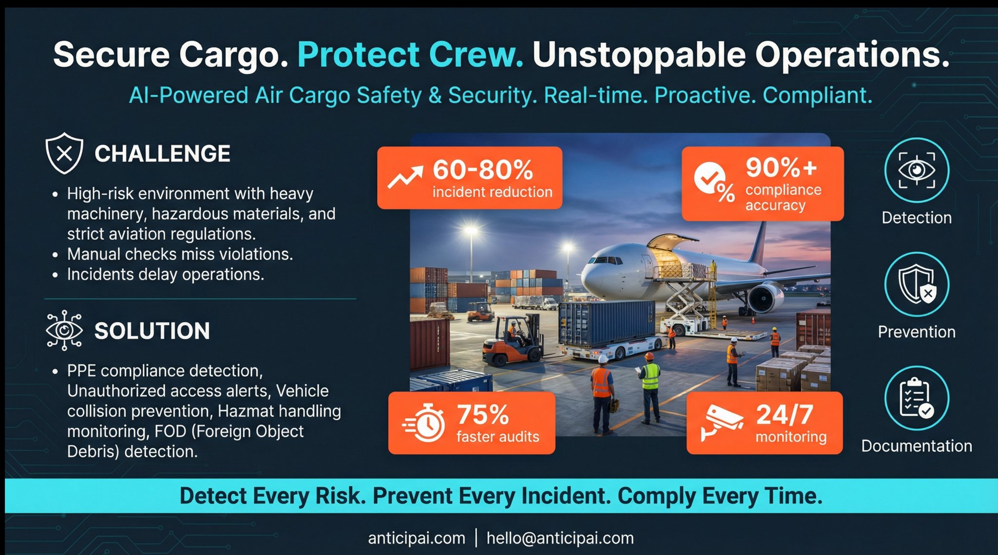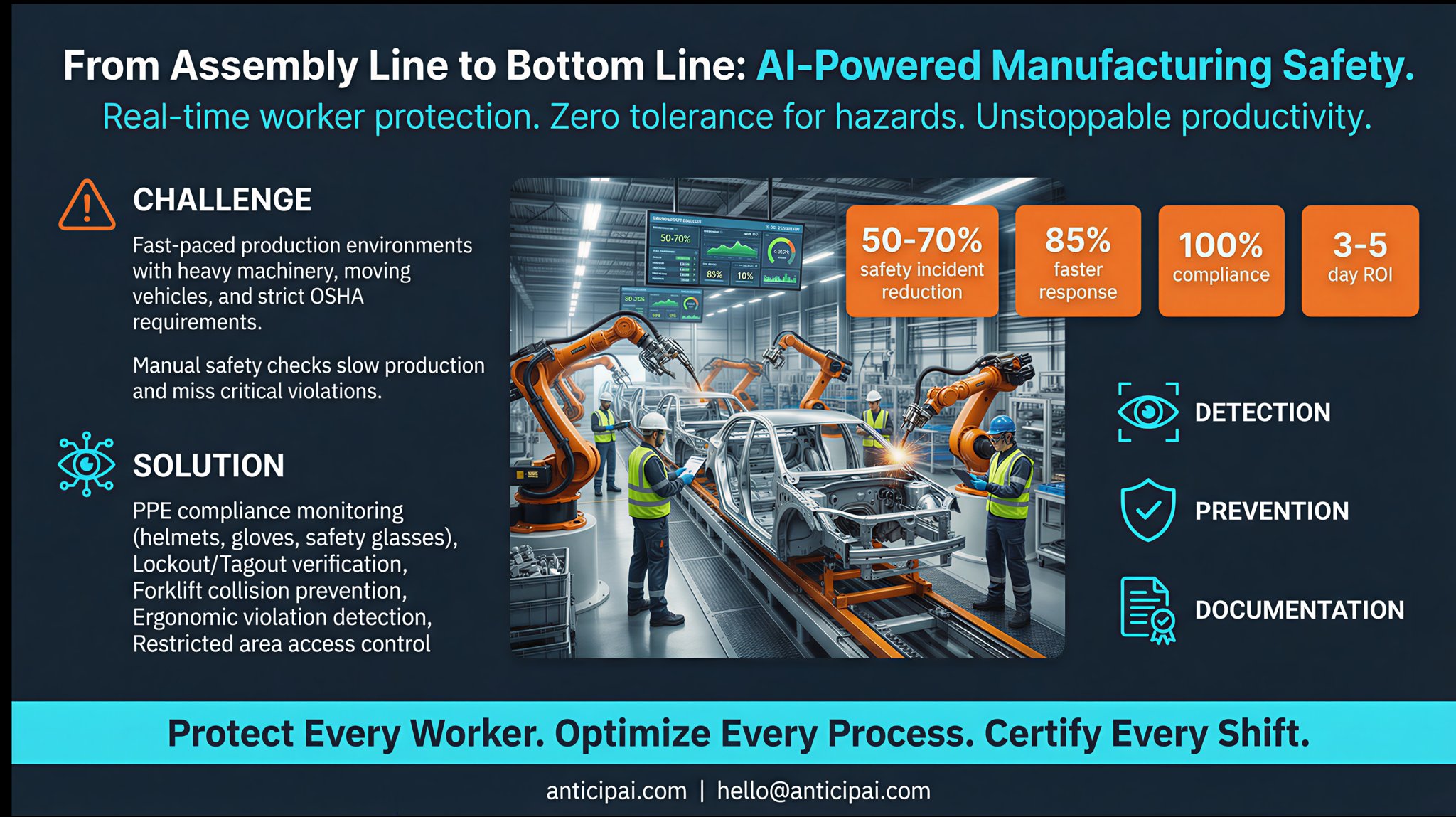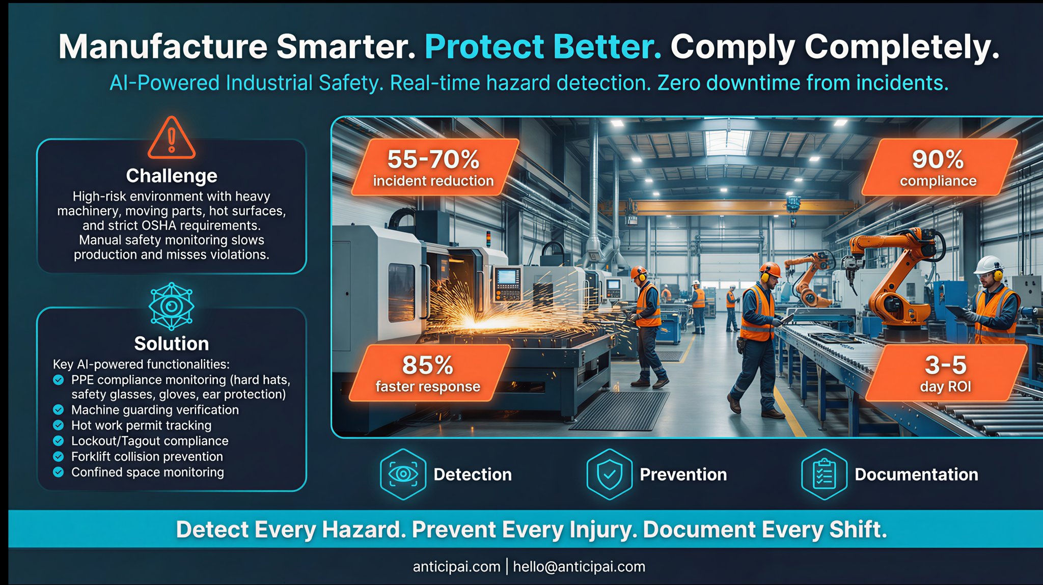 AnticipAI uses advanced AI to detect potential safety hazards in real-time. Our system monitors your workplace 24/7, analyzing video feeds to identify risks before they become incidents.