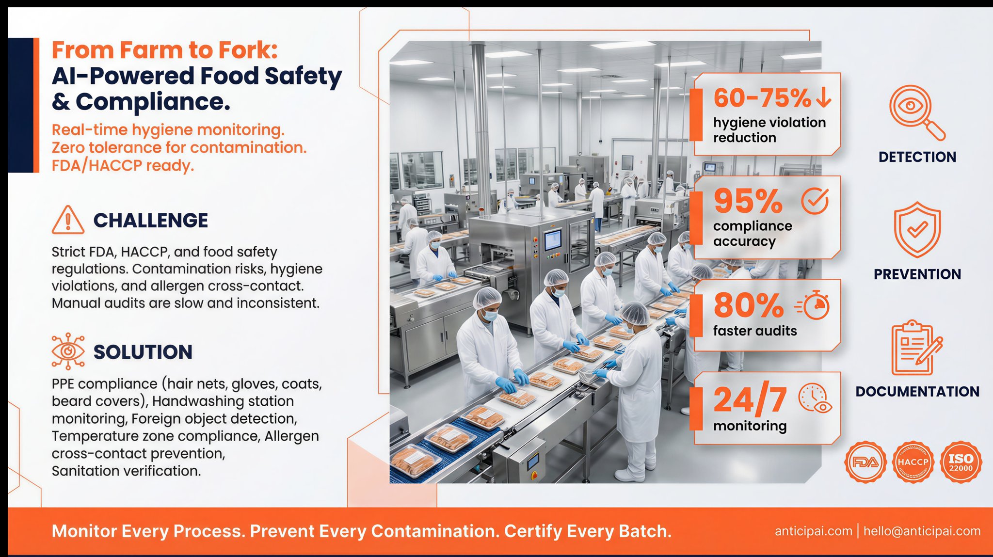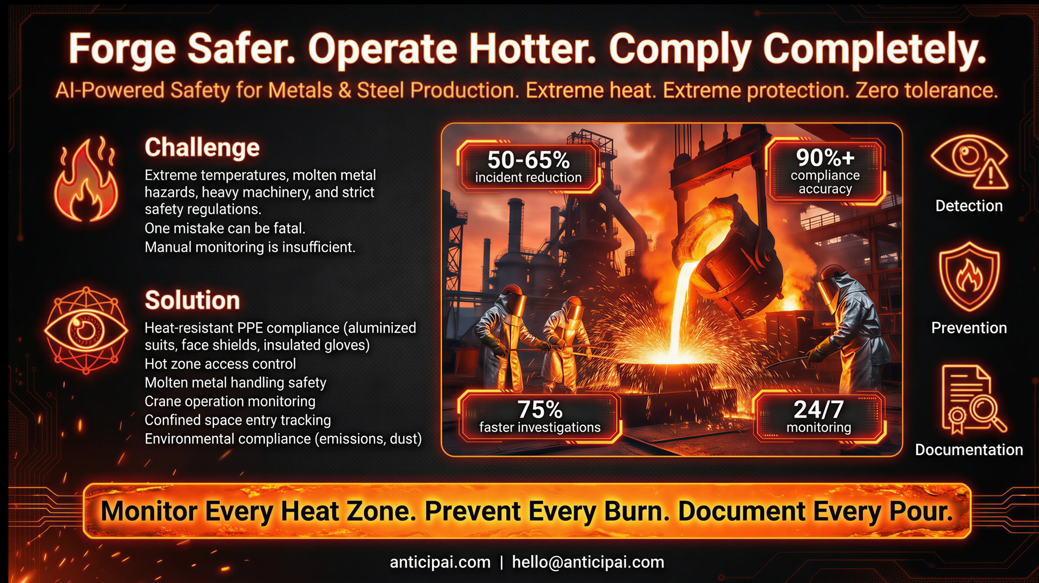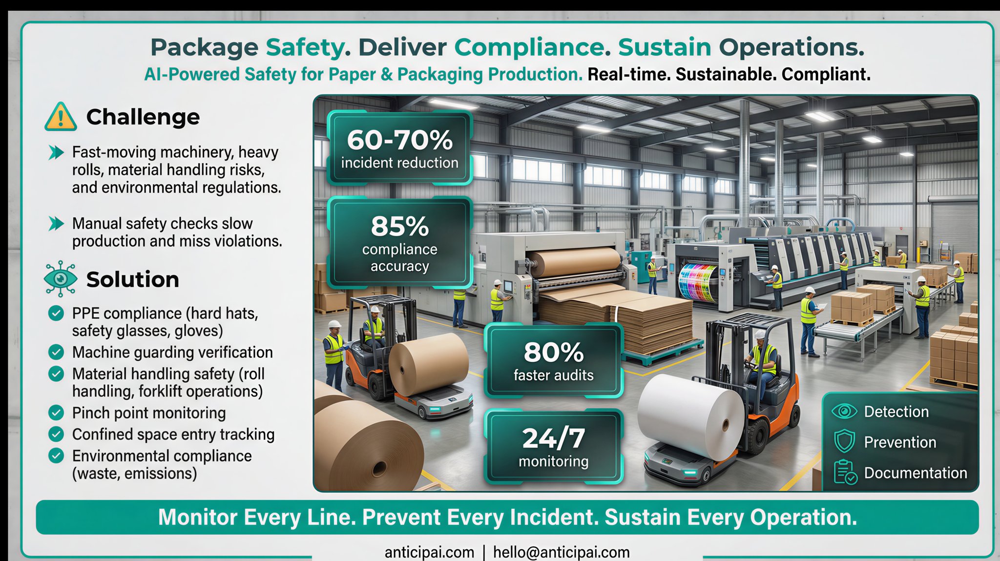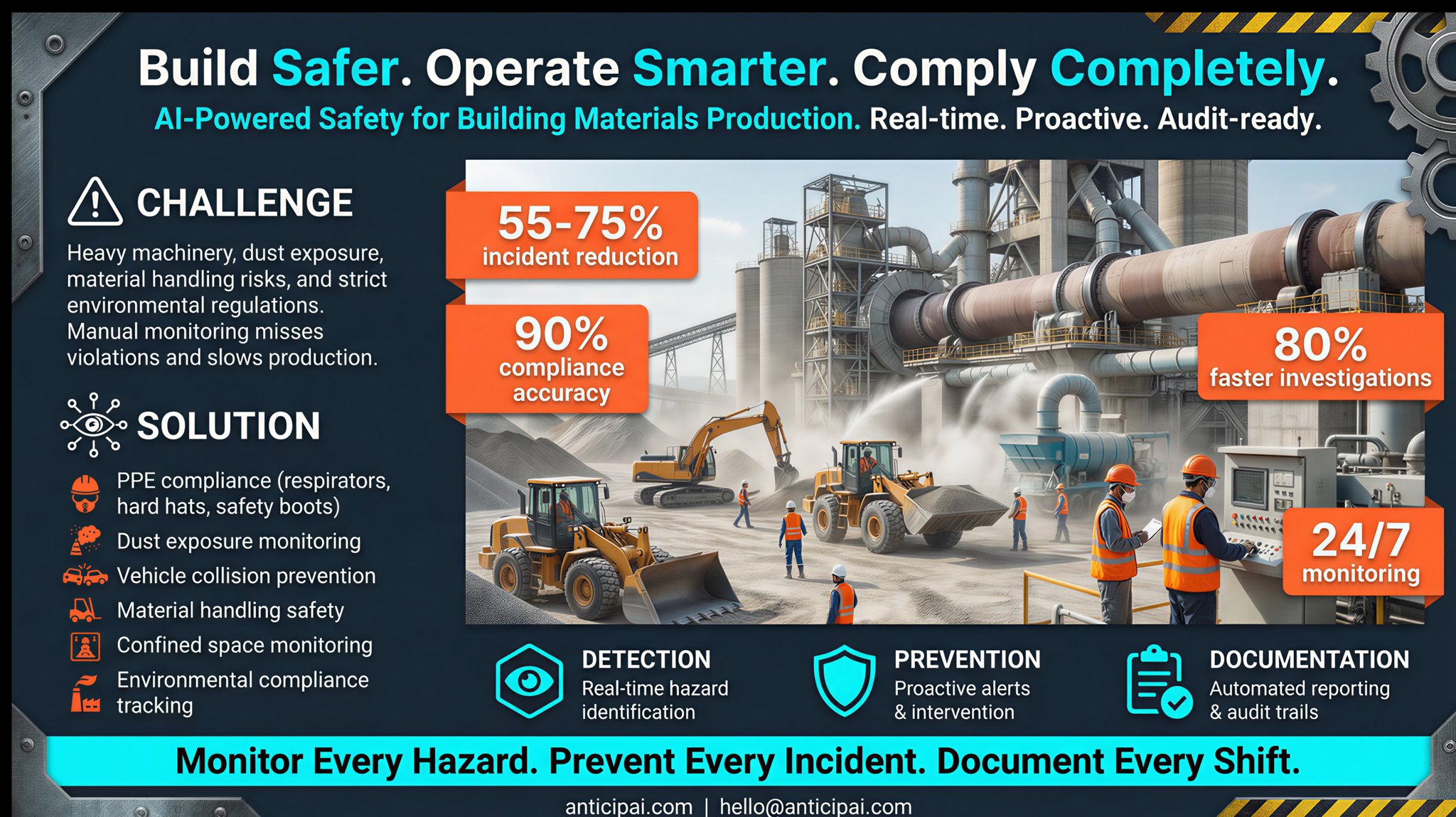 AnticipAI uses advanced AI to detect potential safety hazards in real-time. Our system monitors your workplace 24/7, analyzing video feeds to identify risks before they become incidents.